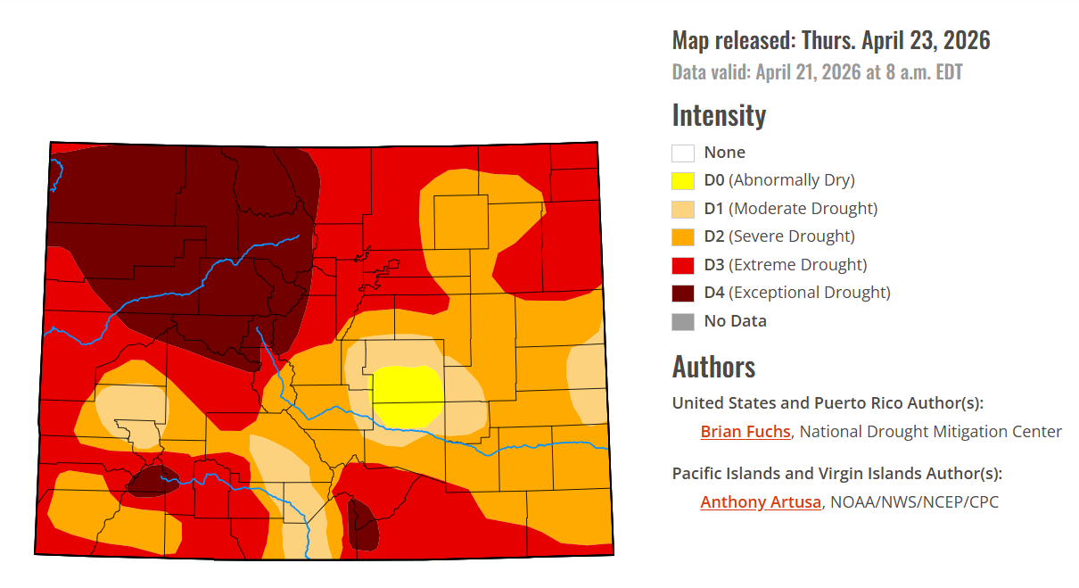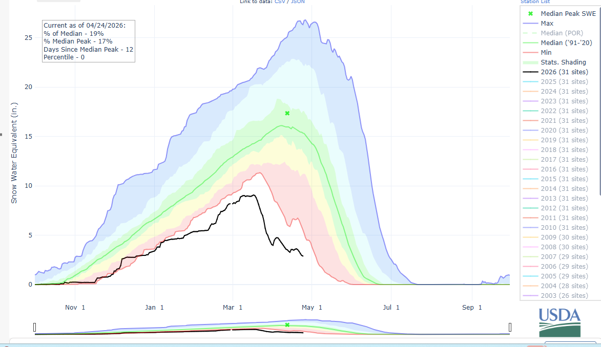 One can’t exaggerate how significant the current year drought is in the Southwest. The Colorado, Green, Platte, Arkansas, and Rio Grande Rivers originate in Colorado. These rivers flow through 19 states (and two feed the Mississippi). As snowpack dwindles, so do the rivers.